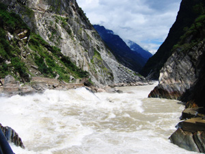 The river is at a very narrow point here, no more than 50 feet wide. Across the white horses of the torrent, we could see the other bank clearly -- the viewing platform there was wet with spray and totally deserted. One could easily imagine a tiger leaping over the gorge here. The water level was so high that the Tiger Leaping Stone was almost submerged in the white water. Watching the mighty river squeezing itself through the cleft between the towering mountains and roaring down the gorge, and almost feeling the spray of the raging waters, it was truly a spectacular sight and a powerful experience.